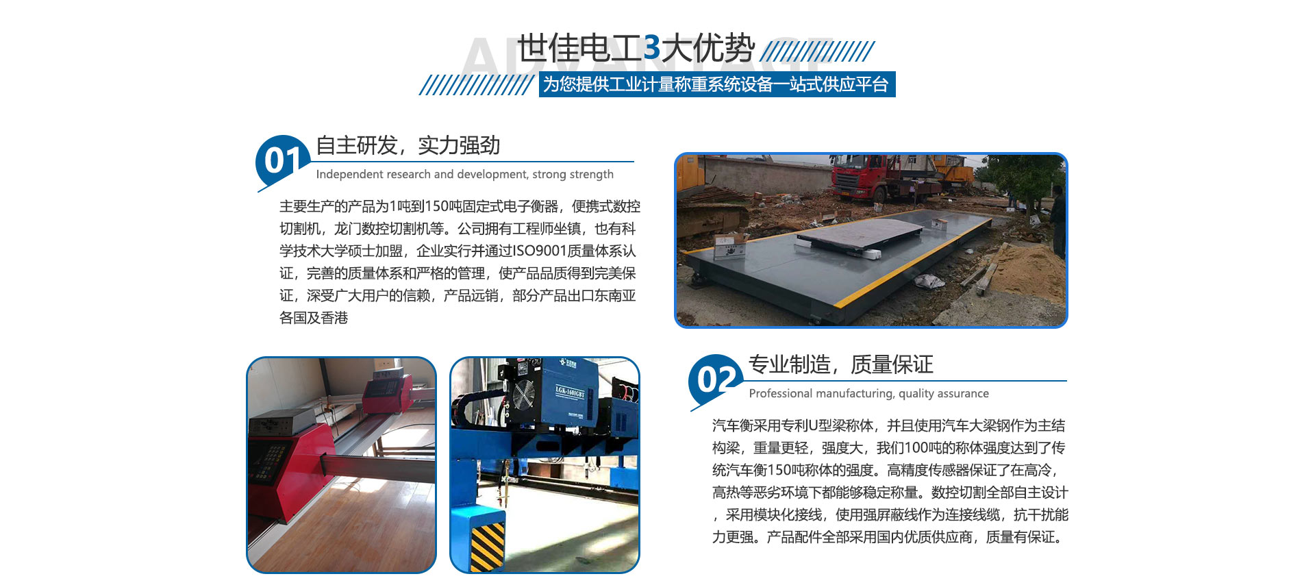 關(guān)于我們合肥世佳電工設(shè)備有限公司是生產(chǎn)、銷售工業(yè)自動(dòng)化設(shè)備。主要生產(chǎn)的產(chǎn)品為1噸到150噸固定式電子衡器,便攜式數(shù)控切割機(jī),龍門數(shù)控切割機(jī)等。公司擁有工程師坐鎮(zhèn),也有中國(guó)科學(xué)技術(shù)大學(xué)碩士加盟,完善的質(zhì)量體系和嚴(yán)格的管理,使產(chǎn)品品質(zhì)得到保證,深受廣大用戶的信賴,產(chǎn)品各地可售,部分產(chǎn)品出口東南亞各國(guó)及香港,數(shù)控切割設(shè)備也在安徽處于前列。我們并不滿足現(xiàn)在所取得的成就,公司繼續(xù)加大科研投入,正在和中科大物理研究所科研人員共同研究開(kāi)發(fā)下一代衡器控制儀表,希望以技術(shù)作為突破口,將公司做大做強(qiáng),為中華崛起盡自己一份綿薄之力。歡迎廣大客戶來(lái)廠參觀訂貨考察。